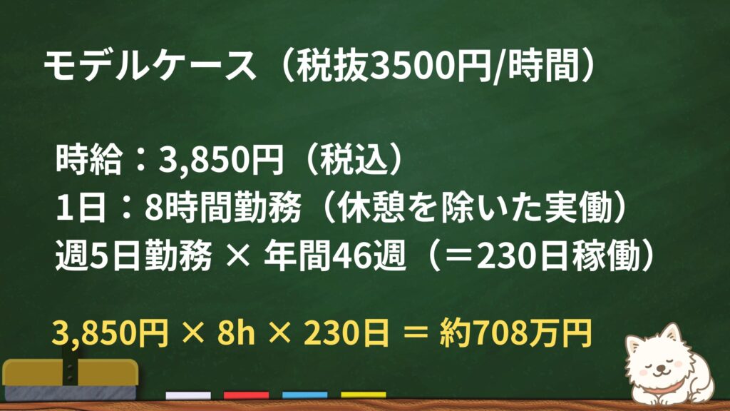 3,850円 × 8h × 年184日(週4×46週)= 約566万円(税込)